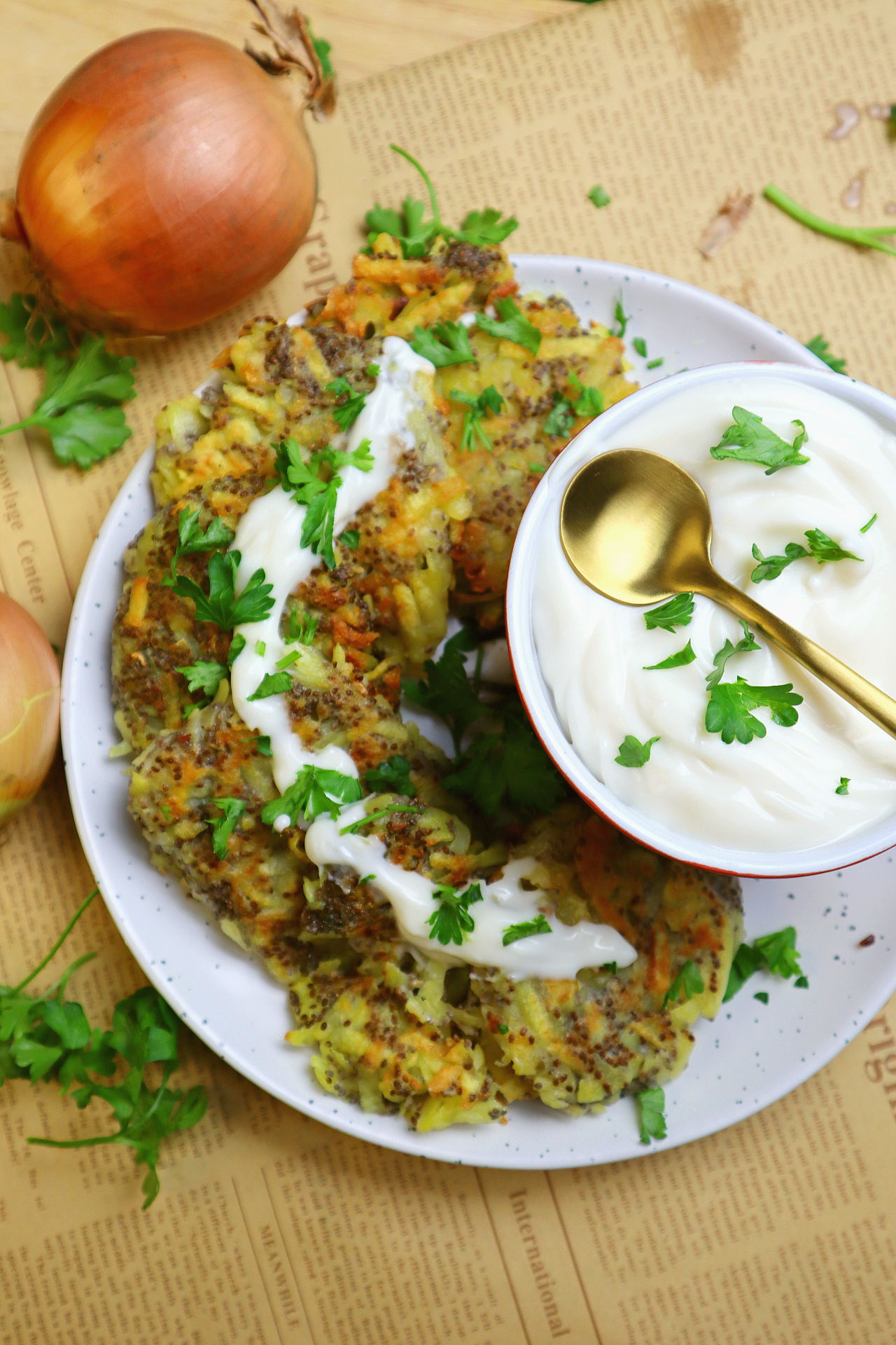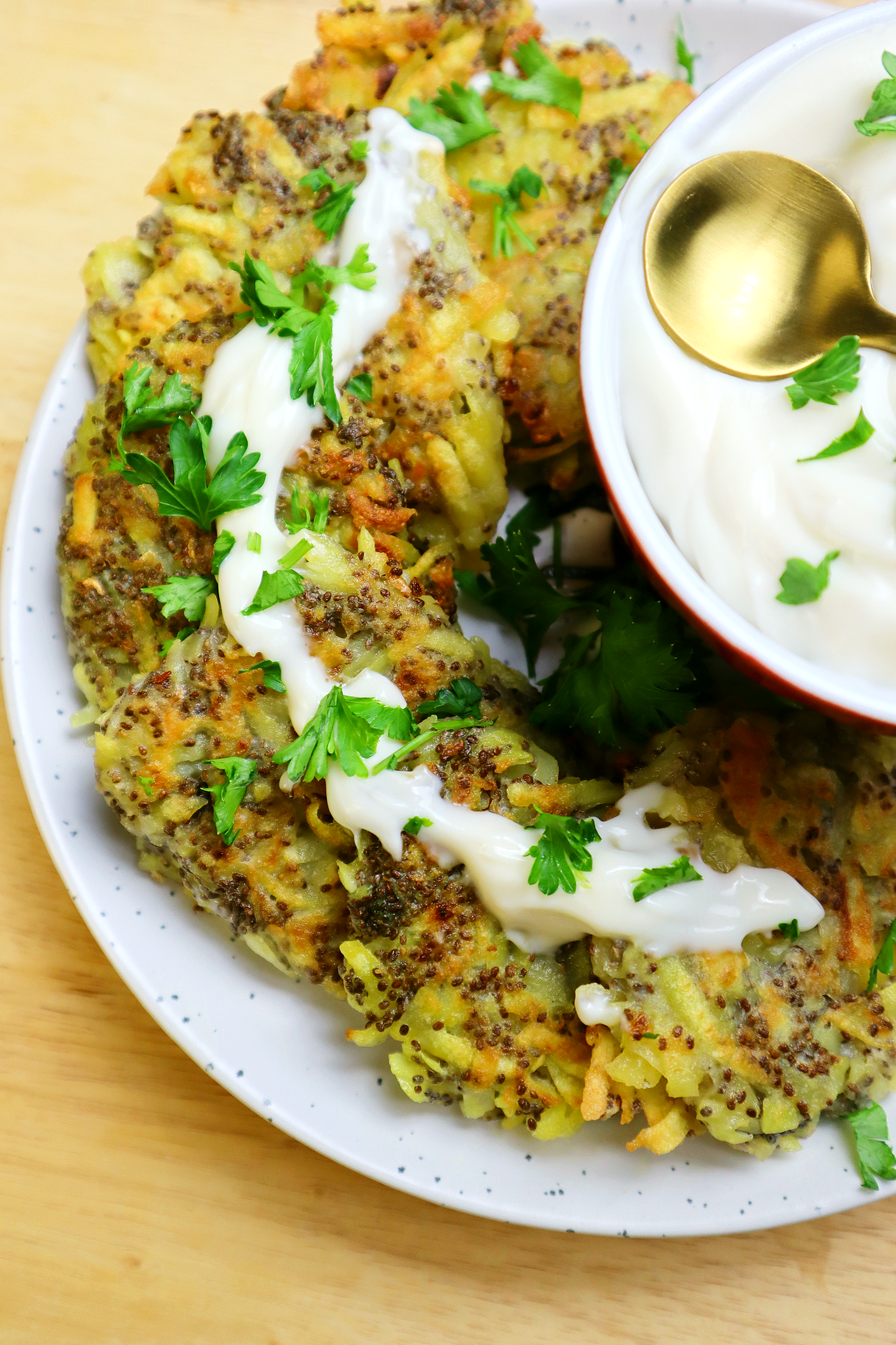 To serve, traditional potato latkes add sour cream / yogurt, apple sauce and green onions on top. I never would’ve thought to serve these with applesauce of all things, which mixes up the sweet and savory palette.